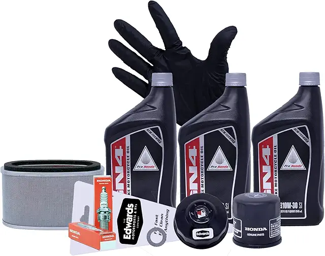 Includes: three quarts of HP4S 10W-30 motorcycle oil, OEM oil filter, OEM air filter, OEM spark plug, crush washer, oil filter wrench, funnel, and pair of nitrile gloves