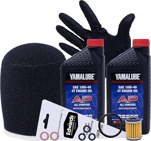 Yamalube SAE 10W-40 4T all purpose engine oil is performance blended mineral oil using high quality base stocks for use in motorcycles, ATVs, side x sides, and scooters. Yamaha air cleaner offers optimized filtration while maximizing airflow. Genuine OEM Yamaha. Formulated with high-quality mineral base oils. Blended for all temperature environments for motorsports products. Advanced friction protection, lubrication and detergency for superior performance. JASO MA-certified. Factory-approved, purpose-built for motorsports products. Includes: two quarts of 10W-40 all purpose engine oil, OEM air filter, OEM oil filter, o-rings, crush washers, pair of nitrile gloves, and funnel
