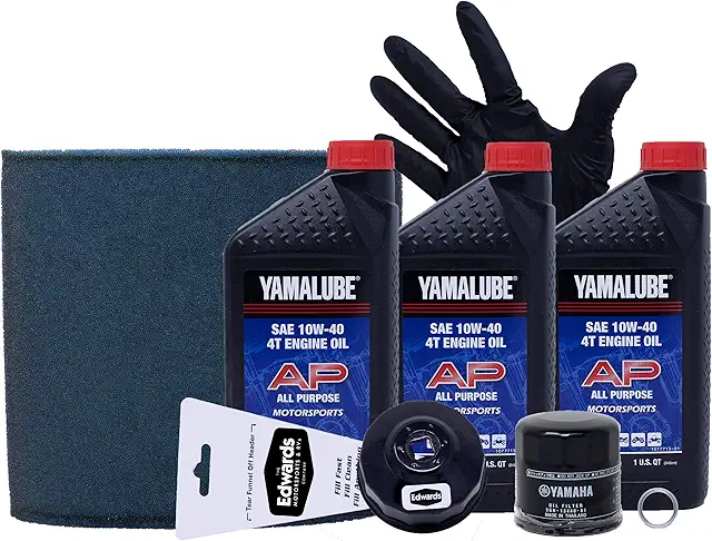 Yamalube SAE 10W-40 4T all purpose engine oil is performance blended mineral oil using high quality base stocks for use in motorcycles, ATVs, side x sides, and scooters. Genuine OEM Yamaha. Formulated with high-quality mineral base oils. Blended for all temperature environments for motorsports products. Advanced friction protection, lubrication and detergency for superior performance. JASO MA-certified. Factory-approved, purpose-built for motorsports products. Includes: three quarts of 10W-40 all purpose engine oil, OEM oil filter, OEM air filter, crush washer, pair of nitrile gloves, and funnel