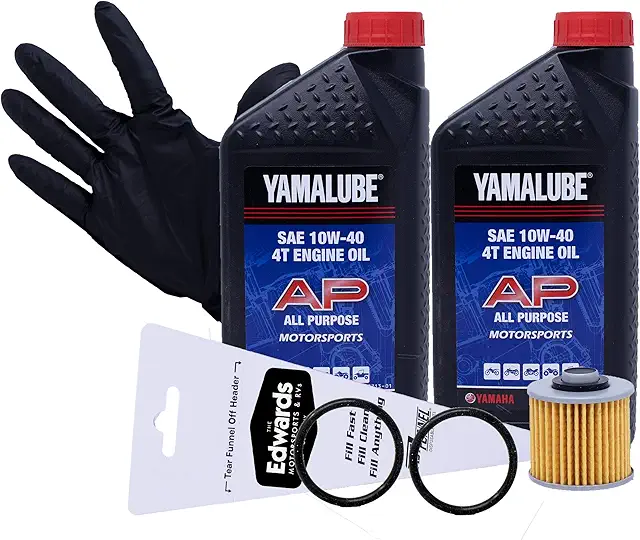 Yamalube SAE 10W-40 4T all purpose engine oil is performance blended mineral oil using high quality base stocks for use in motorcycles, ATVs, side x sides, and scooters. Genuine OEM Yamaha. Formulated with high-quality mineral base oils. Blended for all temperature environments for motorsports products. Advanced friction protection, lubrication and detergency for superior performance. JASO MA-certified. Factory-approved, purpose-built for motorsports products. Includes: two quarts of 10W-40 all purpose engine oil, OEM oil filter, o-rings, pair of nitrile gloves, and funnel